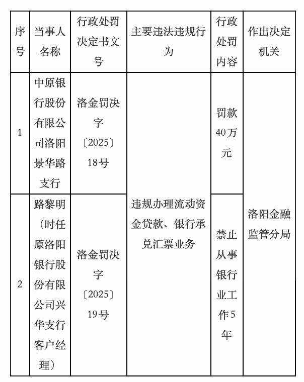 同时,时任原洛阳银行股份有限公司兴华支行客户经理路黎明,被禁止从事银行业工作5年。