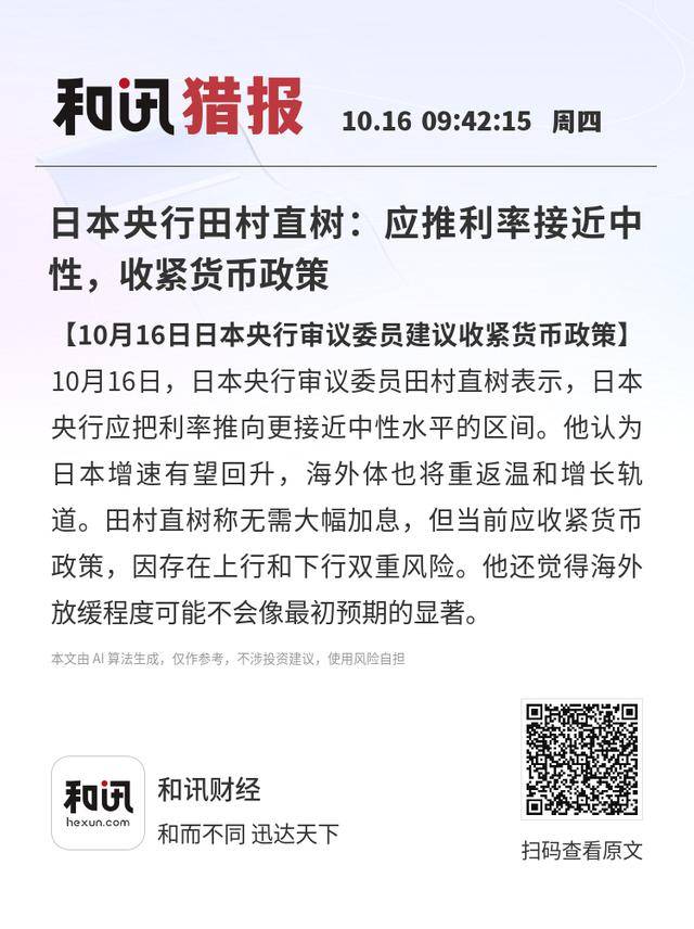 【10月16日日本央行审议委员建议收紧货币政策】10月16日,日本央行审议委员田村直树表示,日本央行应把利率推向更接近中性水平的区间。他认为日本增速有望回升,海外体也将重返温和增长轨道。田村直树称无需大幅加息,但当前应收紧货币政策,因存在上行和下行双重风险。他还觉得海外放缓程度可能不会像最初预期的显著。