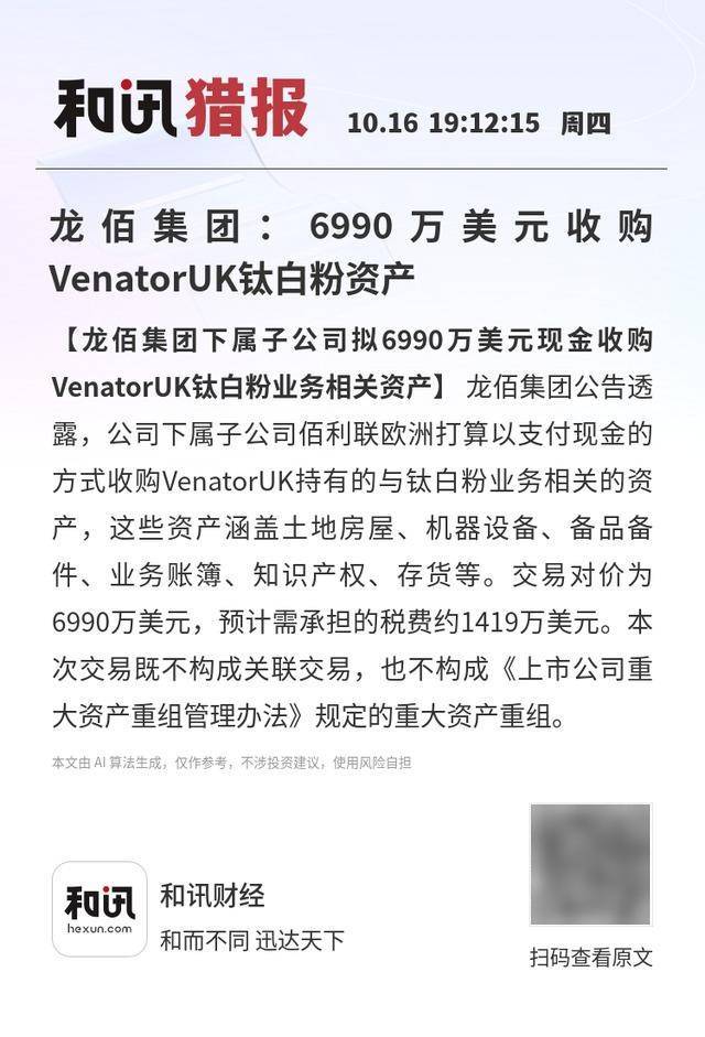 【龙佰集团下属子公司拟6990万美元现金收购VenatorUK钛白粉业务相关资产】龙佰集团公告透露,公司下属子公司佰利联欧洲打算以支付现金的方式收购VenatorUK持有的与钛白粉业务相关的资产,这些资产涵盖土地房屋、机器设备、备品备件、业务账簿、知识产权、存货等。交易对价为6990万美元,预计需承担的税费约1419万美元。本次交易既不构成关联交易,也不构成《上市公司重大资产重组管理办法》规定的重大资产重组。