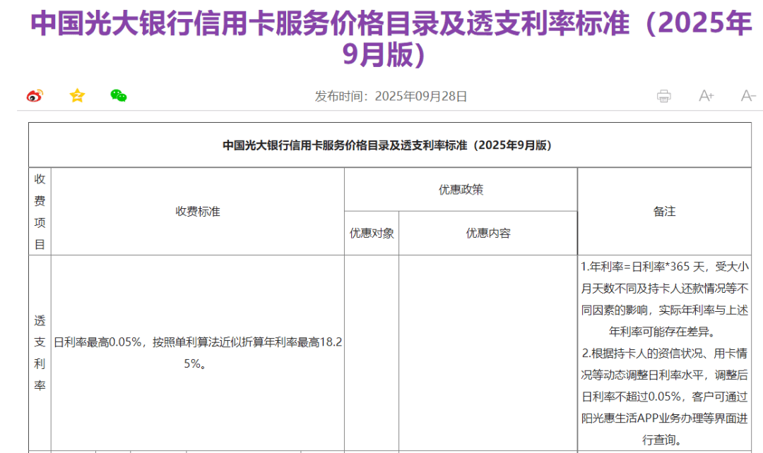 这意味着,信誉良好、用卡记录优秀用户有望享受0%的信用卡透支利率。不过,在9月28日的最新公告中,光大银行删除了对应的下限利率,将表述修改为“日利率最高0.05%”。