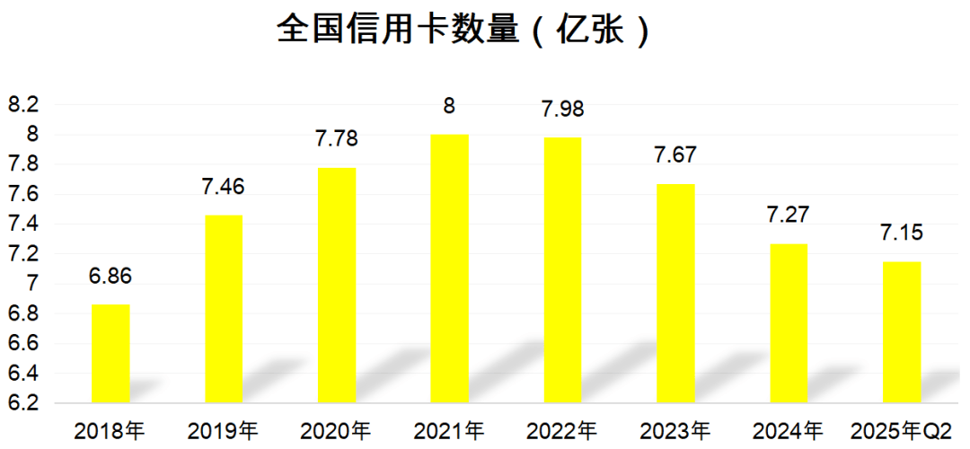 根据央行公布的《支付体系运行总体情况》,截至2025年第二季度末,我国信用卡和借贷合一卡共计7.15亿张,较2024年末减少约1200万张,降幅达1.65%;较2023年末减少约5200万张,降幅达6.78%。