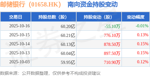 证券之星消息,10月16日南向资金减持55.1万股邮储银行(01658.HK)。近5个交易日中,获南向资金增持的有4天,累计净增持3207.9万股。近20个交易日中,获南向资金增持的有9天,累计净增持1550.7万股。截至目前,南向资金持有邮储银行(01658.HK)60.2亿股,占公司已发行普通股的30.3%。