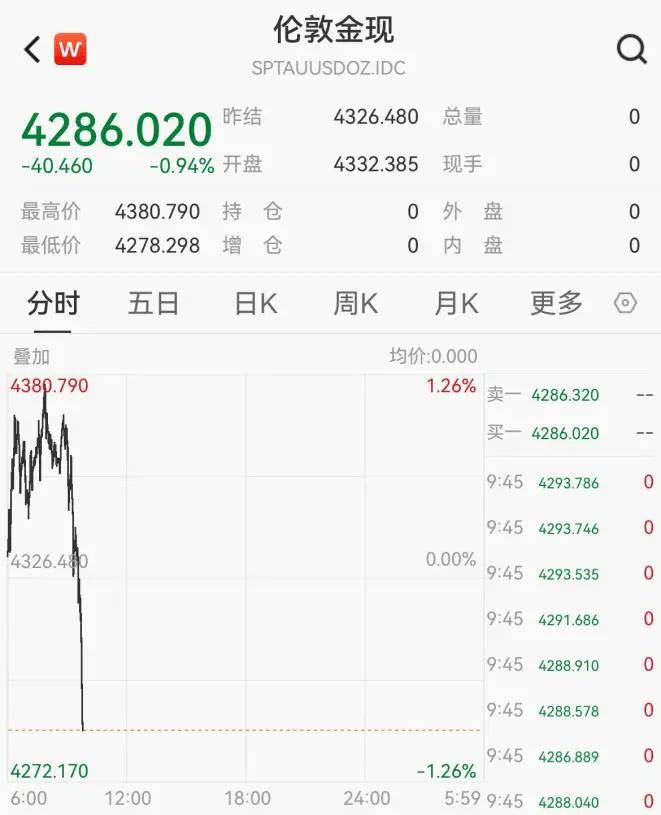 截至发稿,现货黄金报4286.02美元/盎司,日内跌0.94%。