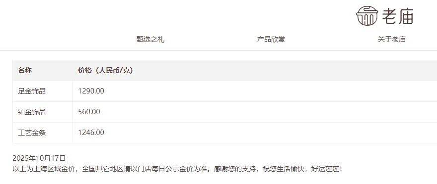 北京时间10月17日,中国商报记者注意到,国内金饰克价已逼近1300元。截至发稿,老庙足金饰品最新报价为1290元/克,较前一日(1248元/克)上涨42元/克,较周一(1189元/克)上涨101元/克;周生生为1281元/克,较前一日(1245元/克)上涨36元/克,较周一(1188元/克)上涨93元/克;周大福为1279元/克,较前一日(1247元/克)上涨32元/克,较周一(1190元/克)上涨89元/克。