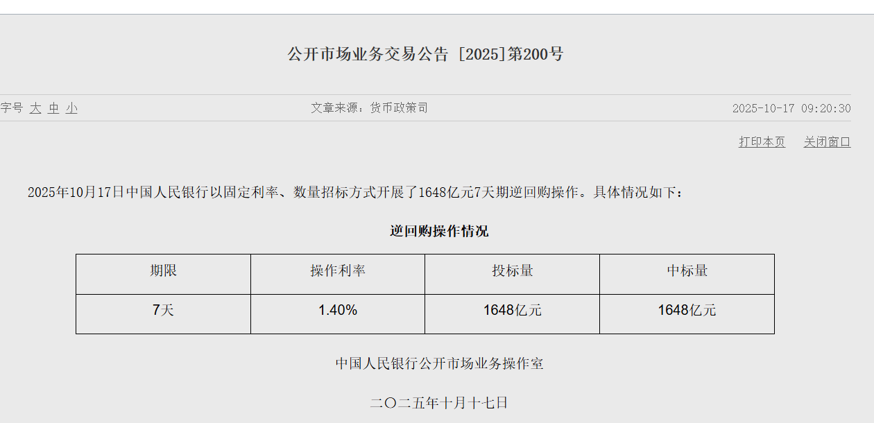 中国人民银行网站消息,10月17日,中国人民银行以固定利率、数量招标方式开展了1648亿元7天期逆回购操作,操作利率为1.40%,与此前持平。因今日有4090亿元7天期逆回购到期,当日实现净回笼2442亿元。