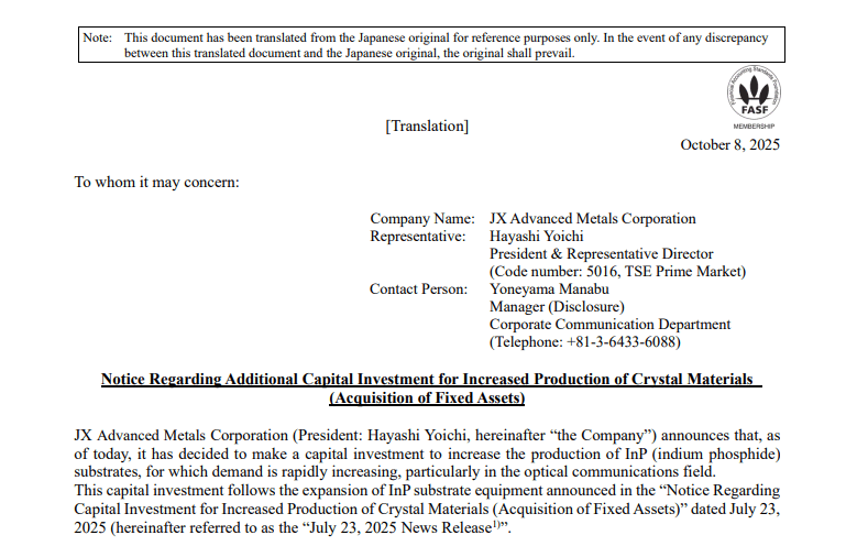 JX金属在7月份宣布了首轮约15亿日元的投资计划(将产能提高约20%)。然而,鉴于AI持续演进带来的InP需求激增速度远超预期,公司决定进一步追加投资。