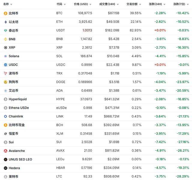 截至券商中国记者发稿时,24小时内,比特币跌超2%报10.90万美元;以太坊跌2.61%报3926美元;XRP跌2.57%,艾达币跌3.3%,BNB跌3.5%,狗狗币、Solana跌超4%。最近7个交易日,受贸易摩擦升级、美国政府关门危机持续等因素影响,比特币、以太坊跌幅超过10%,XRP、Solana跌幅超过15%,艾达币、狗狗币跌超20%。