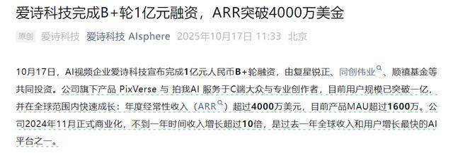 瑞财经 王敏 10月17日,AI视频企业爱诗科技在其官方微信公众号宣布完成1亿元人民币B+轮融资,由复星锐正、同创伟业、顺禧基金等共同投资。