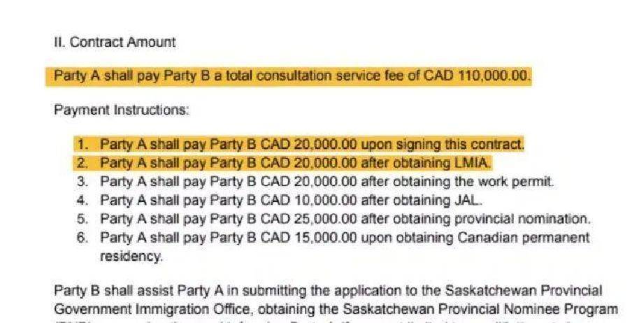 幻觉通常需要一个精心搭建的舞台。June HR Solutions的办公室在市郊一栋不起眼的商业楼里,门面贴满“成功案例”的照片墙,讲述着别人的抵达。公司里说普通话的老板苏军自称“助理顾问”,她的丈夫刘正涛递上CICC执照的影印件作为背书。执照像是一把令牌,让人相信流程会按部就班。合同迅速签下,中英双语,长达二十页,列出总额为11万加元的支付计划:先付2万签约费,LMIA成功后再付2万,加上工作许可获批的2万,后续永久居留阶段按节点支付剩余部分。CBC后来审阅到的合同版本还把节点拆得更细:LMIA后2万、工作许可后2万、SINP提名后3万、PR获批后4万。条款“分阶段付费、风险共担”,听上去克制合理,但细则里无退款、成功定义模糊、代理人免责声明一应俱全。