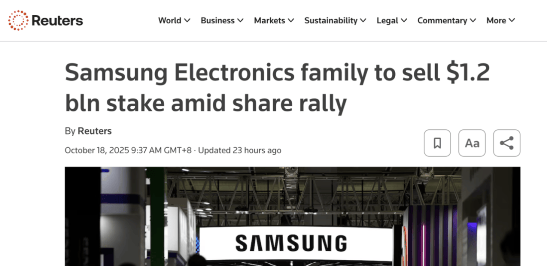 10月19日消息,据路透社报道,三星电子在一份监管文件中披露,董事长李在镕的母亲和两个姐妹计划出售所持公司0.3%的股份,价值约1.73万亿韩元(约合12.2亿美元)。