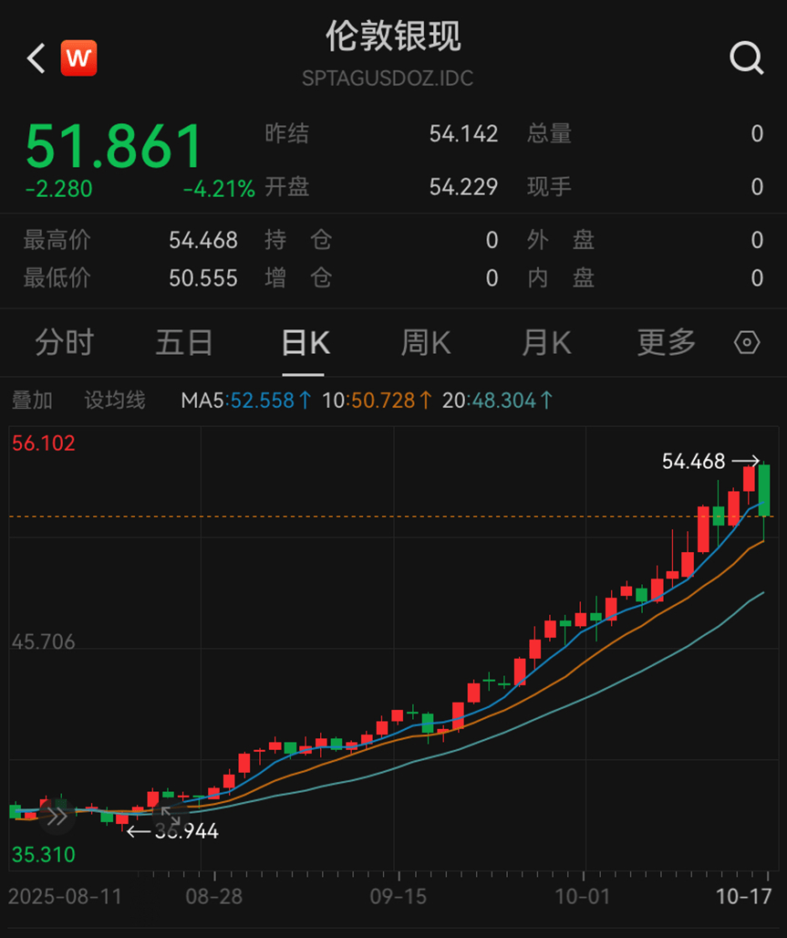 上周五(10月17日)美股交易时段,现货黄金在连续刷新历史记录后回调,伦敦金现最高触及4380.79美元/盎司后短线跳水,最终收跌1.73%,报4251.448美元/盎司。现货白银价格同步回调,当日大跌逾4%。