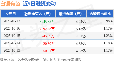 证券之星消息,10月17日,白银有色(601212)融资买入2.01亿元,融资偿还2.4亿元,融资净卖出3945.35万元,融资余额4.74亿元,近20个交易日中有11个交易日出现融资净买入。