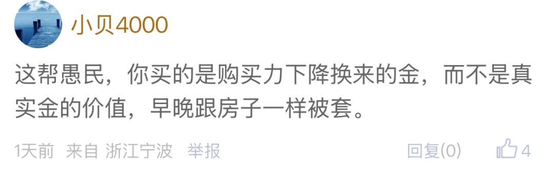 还有网友认为, 大家买的不是真实黄金的价值,而是购买力下降带来的金,早晚会跟房子一样被套。这种观点也反映出大家对黄金市场未来走势的担忧。