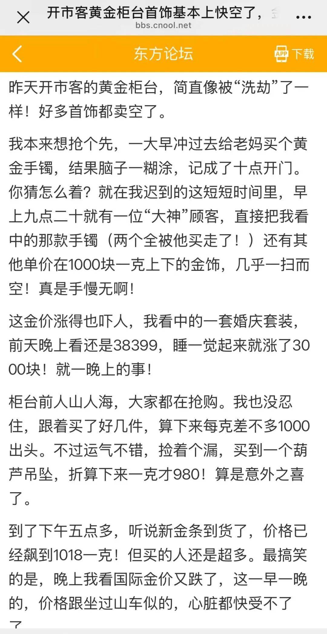确实,在金价上涨的时候,大家都担心错过这波行情,纷纷跟风购买,生怕之后价格更高。 也有网友评价:“物极必反。”