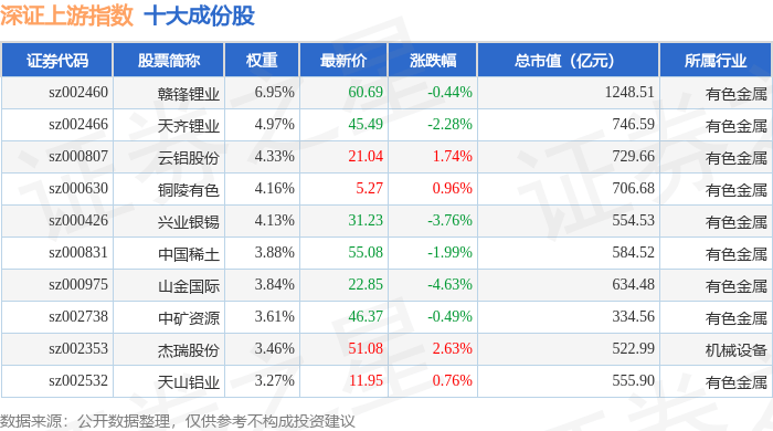 证券之星消息,10月20日,深证上游(399704)指数报收于5772.41点,跌0.38%,成交531.8亿元,换手率3.25%。当日该指数成份股中,上涨的有24家,楚江新材以6.13%的涨幅领涨,下跌的有26家,湖南白银以9.95%的跌幅领跌。