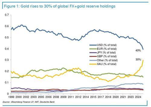 与此同时,美元在同一口径下的占比从43%降至40%。这意味着黄金与美元之间的差距已从19个百分点收窄至10个百分点,缩小了近一半。