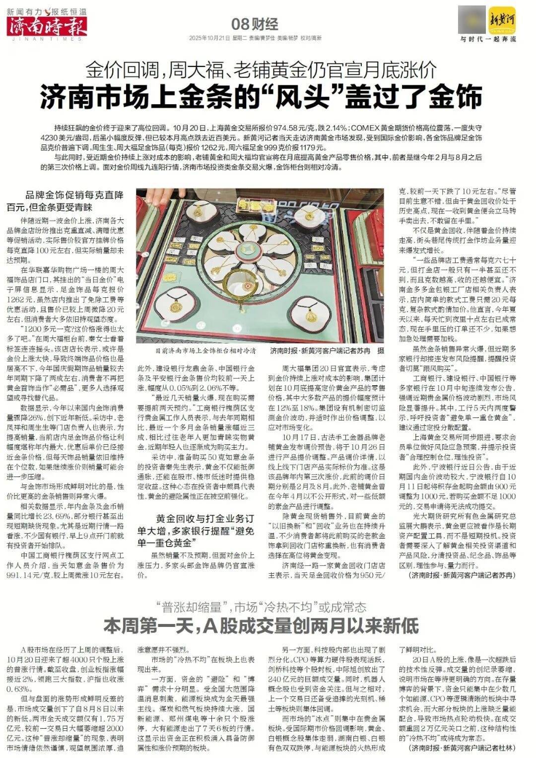 伴随近期一波金价上涨,济南各大品牌金店纷纷推出克重直减、满赠优惠等促销活动,品牌金饰实际售价较官方挂牌价格每克直降100元左右,但实际销量却未达预期。