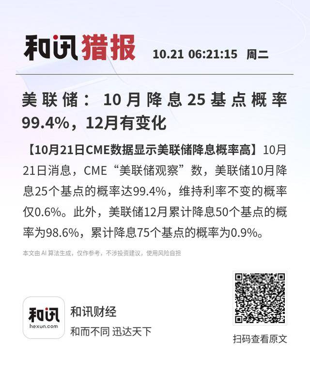 【10月21日CME数据显示美联储降息概率高】10月21日消息,CME“美联储观察”数,美联储10月降息25个基点的概率达99.4%,维持利率不变的概率仅0.6%。此外,美联储12月累计降息50个基点的概率为98.6%,累计降息75个基点的概率为0.9%。