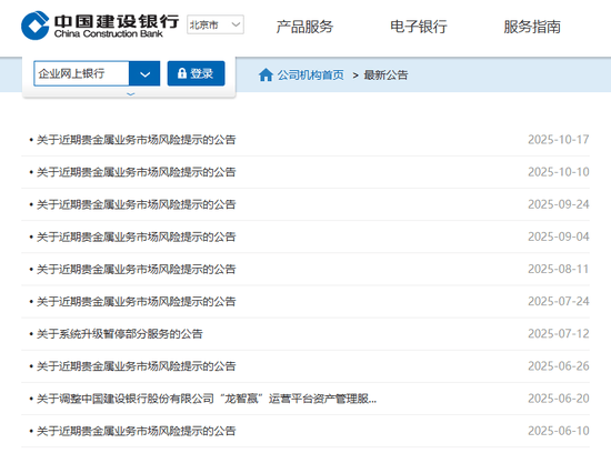 除建行外,招商银行、兴业银行、民生银行、中信银行在内的多家商业银行近期也陆续在官网发布贵金属业务市场风险提示公告。