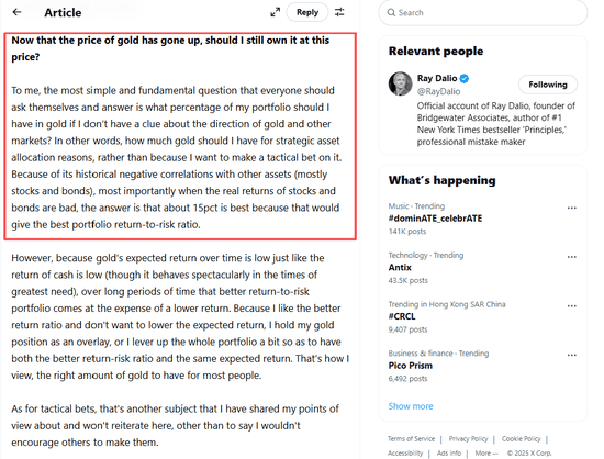 近日,桥水基金创始人达利欧在社交平台发文,阐述了关于黄金的一些看法。关于对黄金的理解,达利欧表示,“对我来说,黄金不是金属,而是最根本、最稳固的投资”。