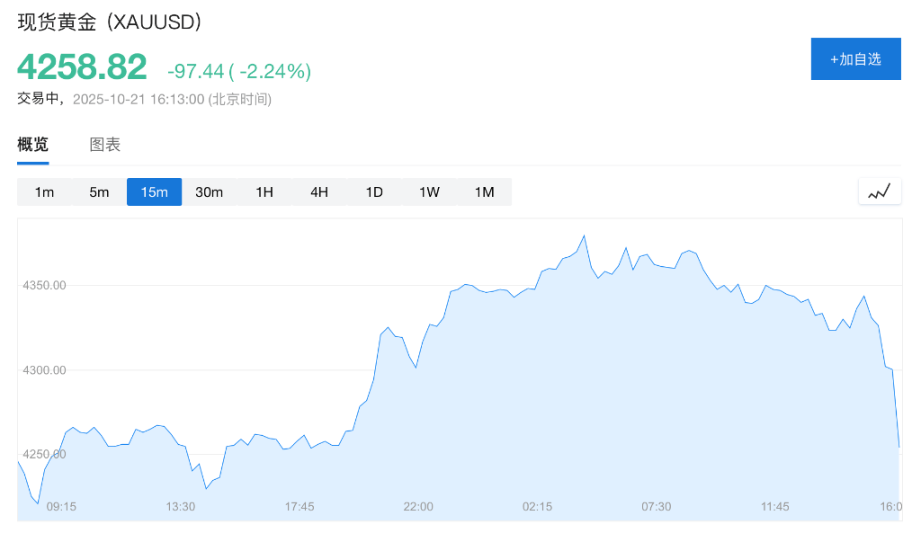 现货黄金跌幅收窄至1.95%,报4271美元/盎司。日内一度跌超2.00%。此前金价不断走强,屡次刷新历史高位。因市场风险情绪缓和,金价回落。