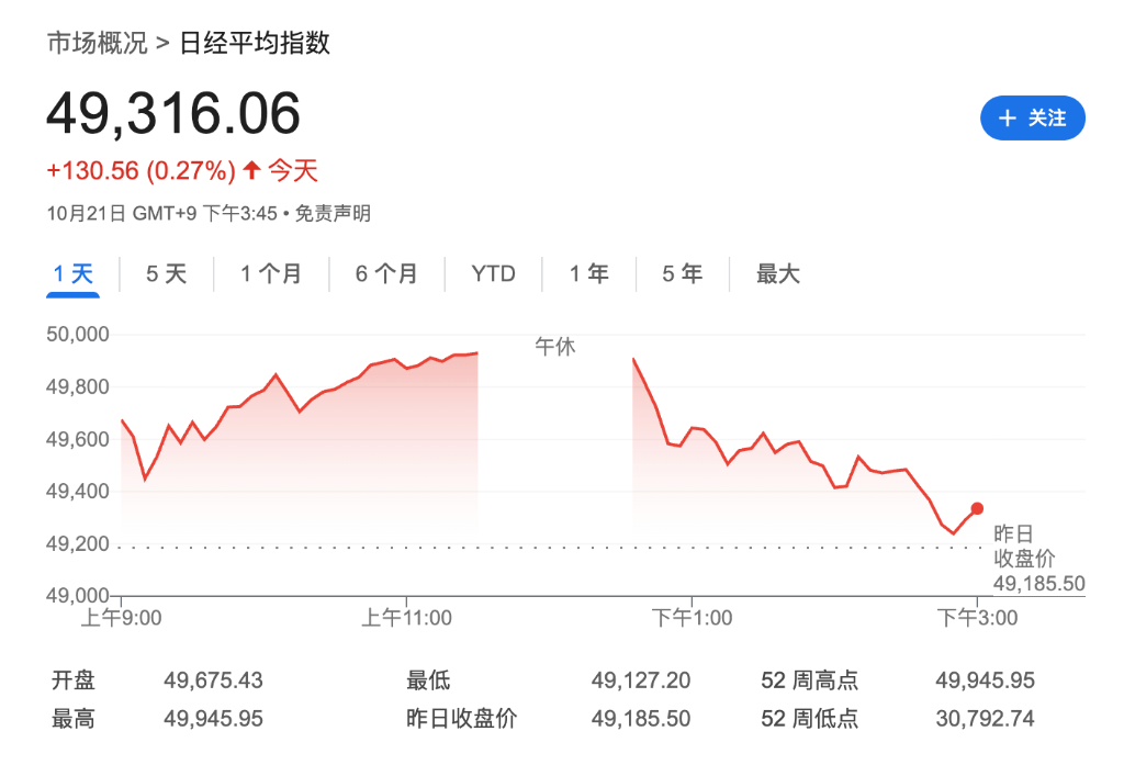 日本众议院首相指名选举当天,日本开盘一度上涨1%,报49675.43点。市场普遍将此归因于对新政府将维持扩张性财政政策、推行类似“安倍经济学”路线的强烈预期。