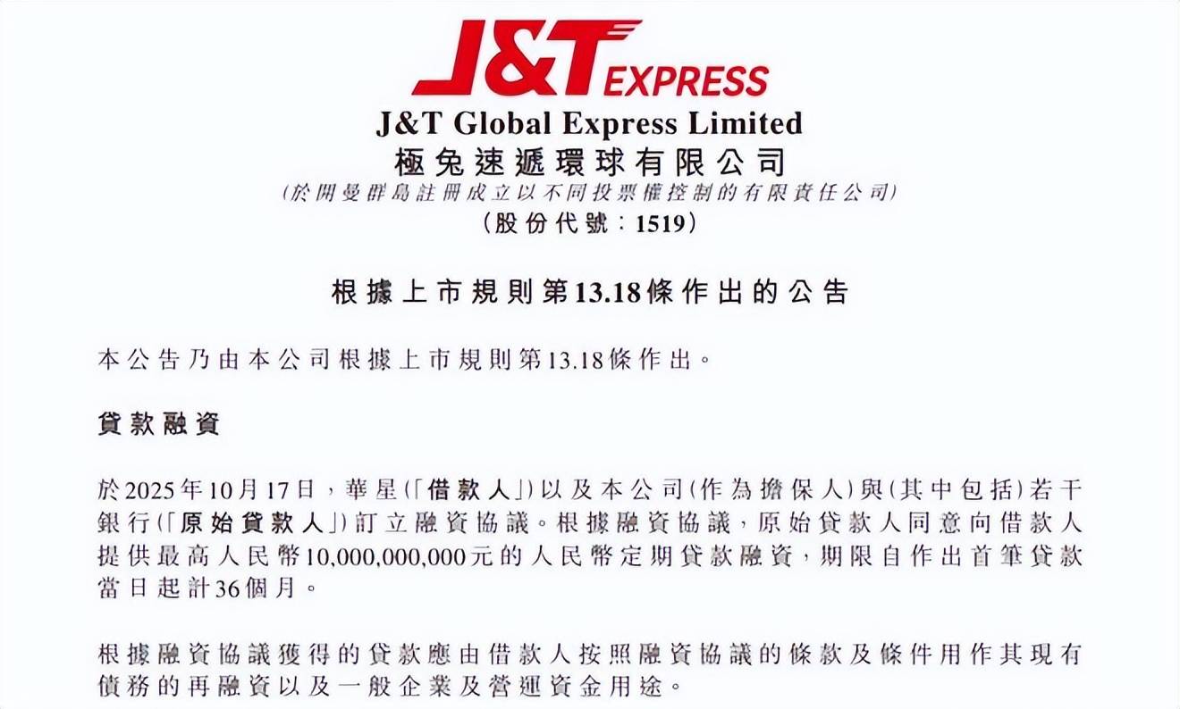 10月17日,极兔速递(股票代码:01519.HK)宣布其全资附属公司华星集团作为借款人,与公司及若干银行签署融资协议,获得最高100亿元人民币的定期贷款融资,贷款期限为36个月。此次融资将主要用于现有债务再融资、一般企业运营资金及优化资本结构。