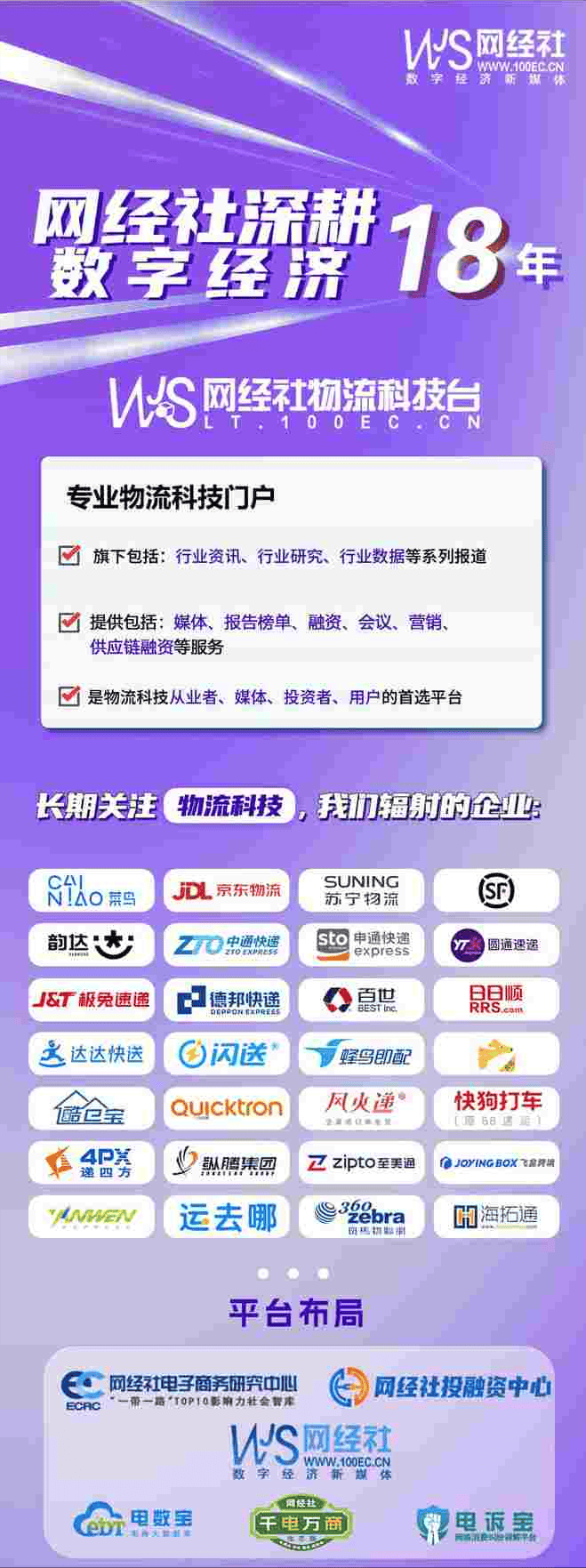 网经社深耕数字经济行业18年,长期关注物流科技,我们辐射的企业有:菜鸟、京东物流、苏宁物流、顺丰、韵达、中通快递、申通快递、圆通速递、极兔速递、德邦快递、百世、日日顺、达达快送、闪送、蜂鸟即配、酷仓宝、风火递、快狗打车、纵腾集团、至美通、飞盒跨境、递四方、运去哪、海拓通。