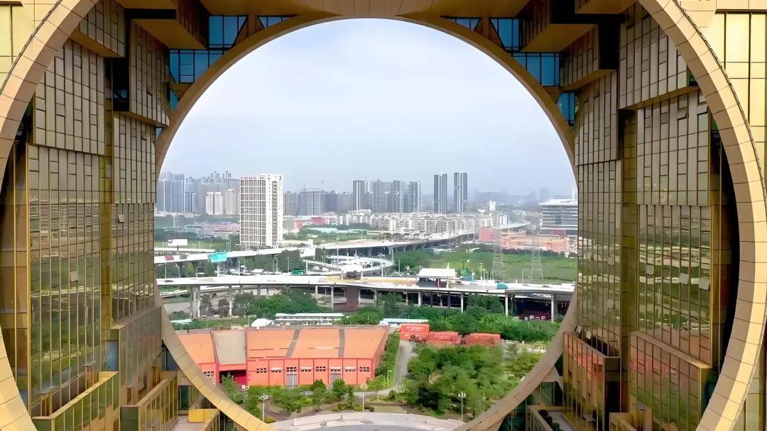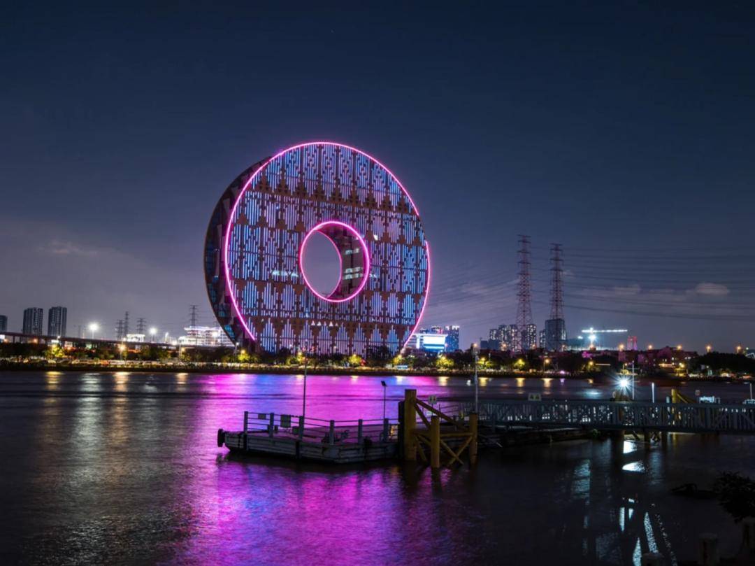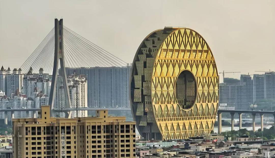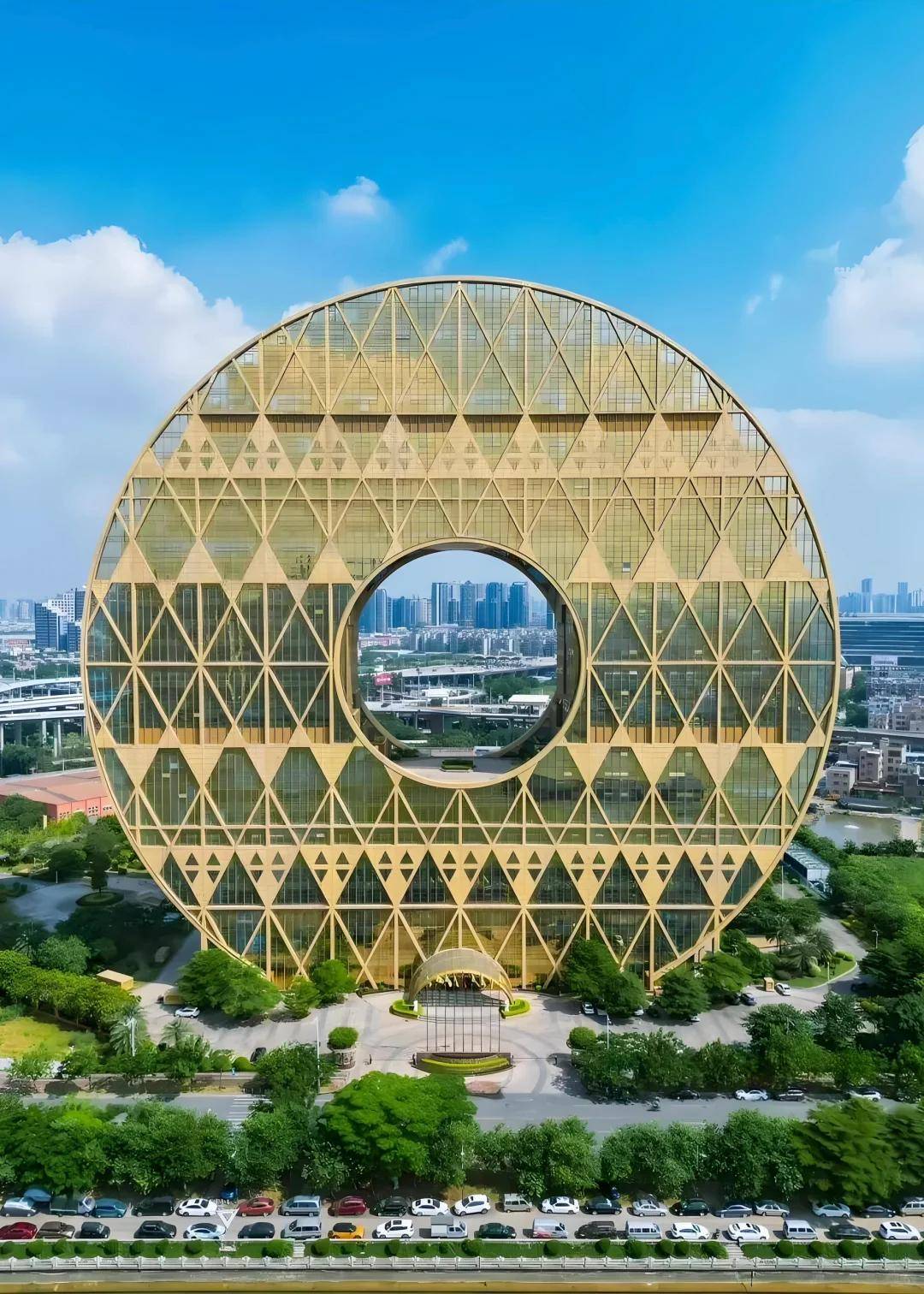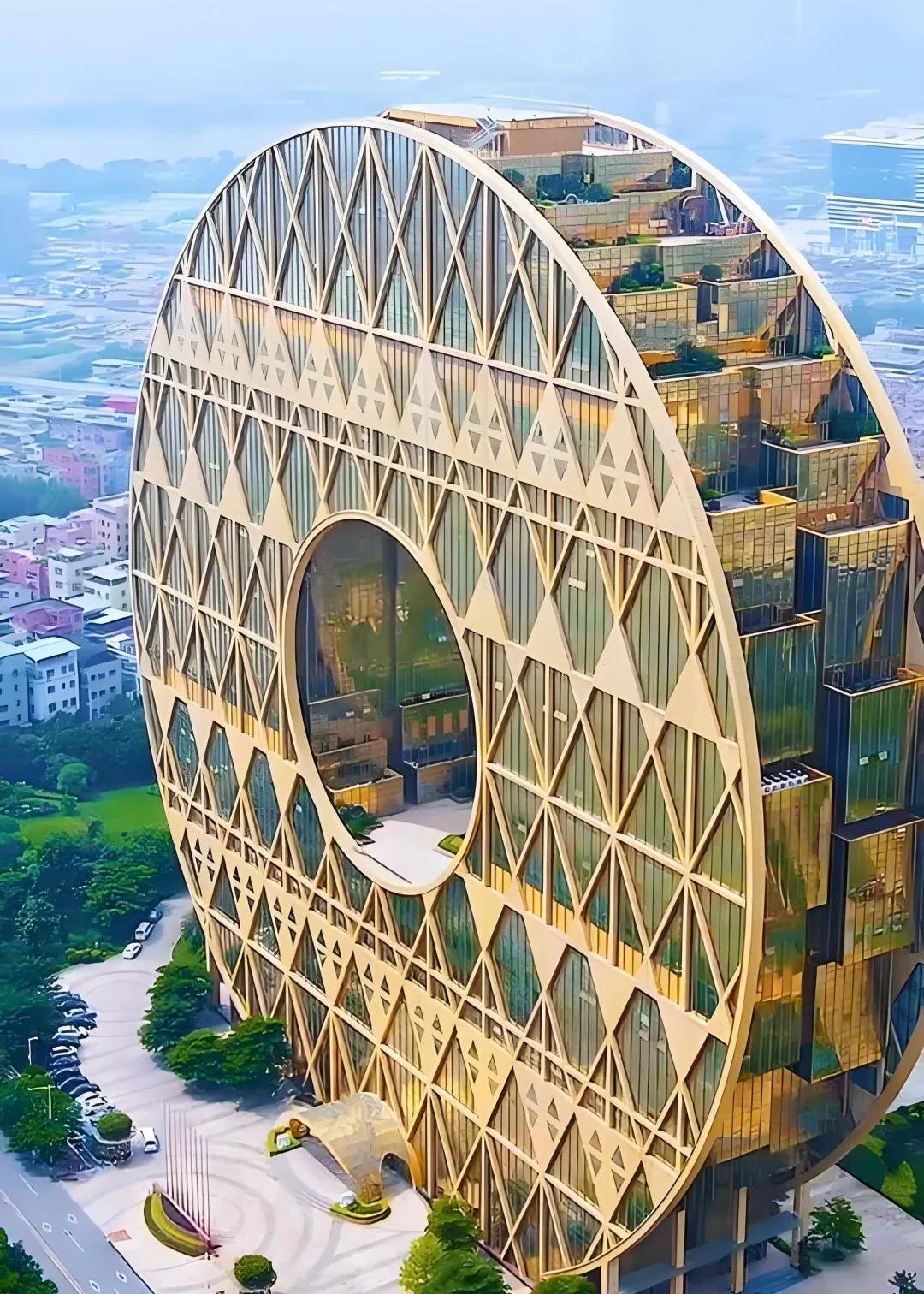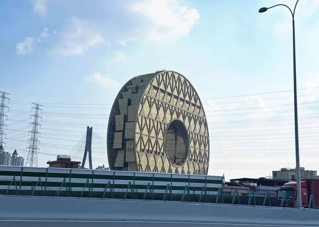 远远看去,整座建筑如同一枚巨大的金色圆环,在日光下熠熠生辉,不少人初见此景,都不禁驻足凝望。有人说它像一枚从天而降的铜钱,也有人说它像水车或是玉璧,但无论如何,它都以一种近乎张扬的姿态,成为这座城市中难以忽视的存在。