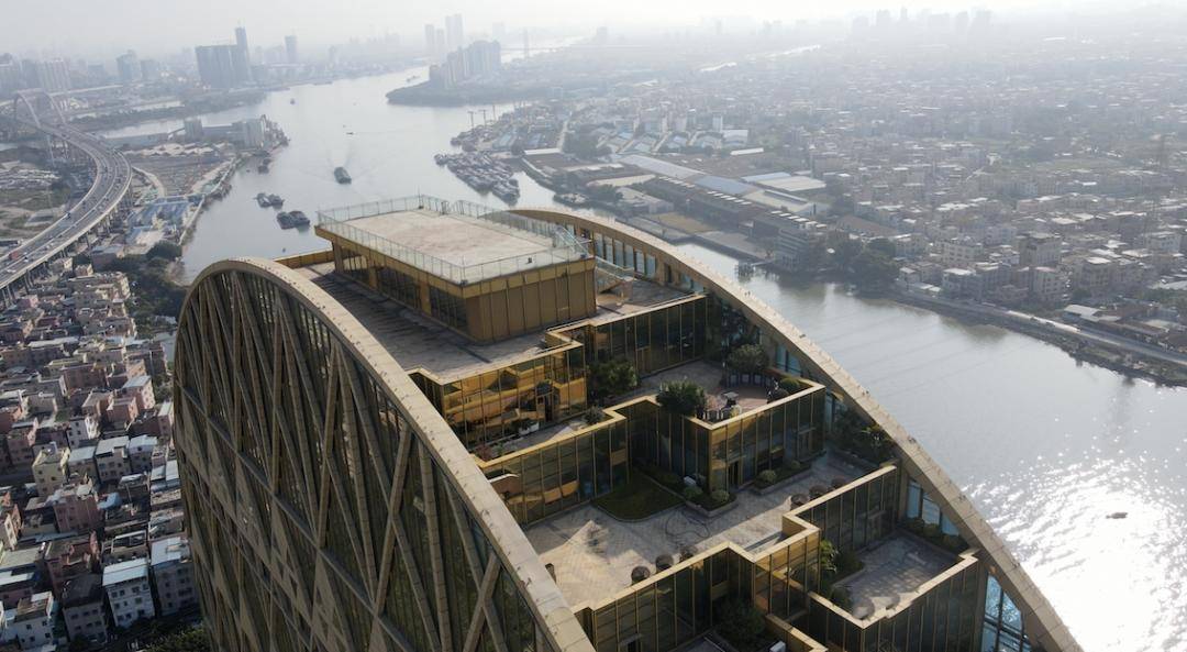 据说顶楼不仅设有董事长办公室,还配备了专用停机坪,处处透露出不凡的气派。可惜的是,尽管造型抢眼,它所处的白鹅潭经济圈南端,交通却并不算便利,距离最近的地铁站也有6.8公里,不少本地人虽知其名,却少有人真正走进其中一探究竟。