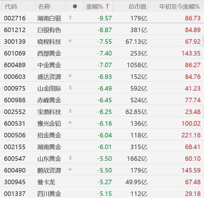 A股市场黄金概念股全线下挫,其中,湖南白银逼近跌停,白银有色跌超8%,晓程科技、西部黄金、中金黄金跌超7%,盛达资源、山金国际、赤峰黄金、宝鼎科技、豫光金铅、招金黄金、湖南黄金跌超6%,山东黄金、鹏欣资源、曼卡龙、四川黄金跌超5%。