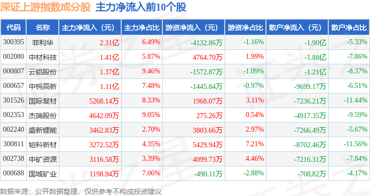 资金流向方面,深证上游(399704)指数成份股当日主力资金净流出合计11.9亿元,游资资金净流入合计1.82亿元,散户资金净流入合计10.08亿元。成份股资金流向详情见下表: