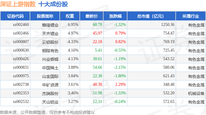 证券之星消息,10月22日,深证上游(399704)指数报收于5821.66点,跌0.9%,成交560.36亿元,换手率3.19%。当日该指数成份股中,上涨的有14家,中钨高新以3.54%的涨幅领涨,下跌的有35家,湖南白银以7.71%的跌幅领跌。