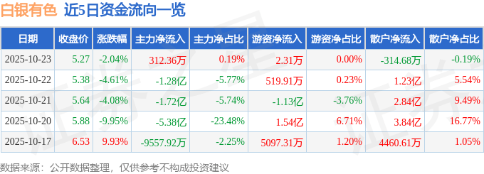 证券之星消息,截至2025年10月23日收盘,白银有色(601212)报收于5.27元,下跌2.04%,换手率4.25%,成交量315.07万手,成交额16.49亿元。