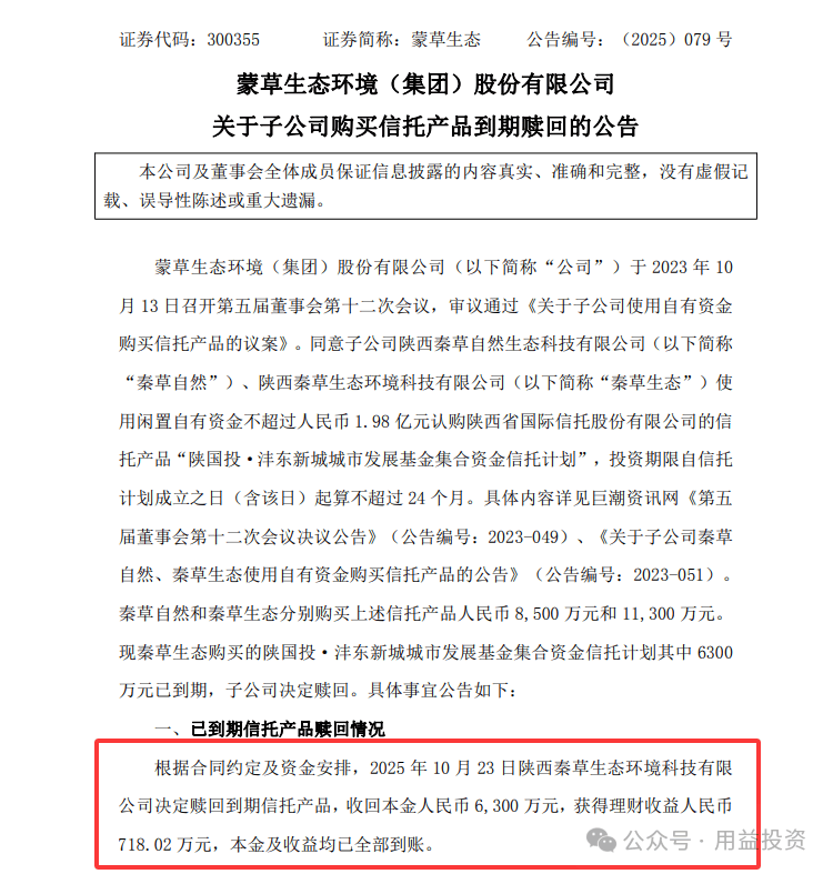 2025年10月23日,蒙草生态环境(集团)股份有限公司(下称“蒙草生态”或“公司”)发布公告称,其控股子公司陕西秦草生态环境科技有限公司(以下简称“秦草生态”)已完成一笔信托产品的到期赎回,收回本金人民币6300万元,获得理财收益人民币718.02万元,本金及收益均已全部到账。