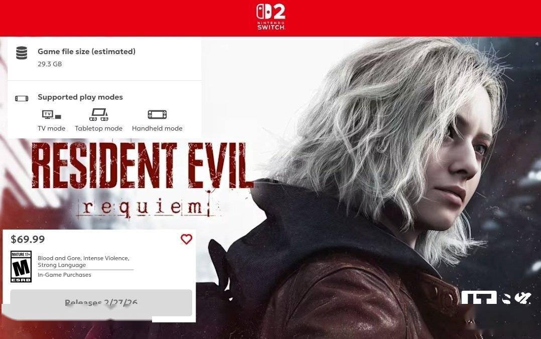 IT之家 10 月 26 日消息,《生化危机:安魂曲》是《生化危机》主系列的第九部正统作品,将于 2026 年 2 月 27 日正式登陆 Switch 2 平台。数周前,卡普空(Capcom)宣布该游戏将在 Switch 2 平台上同时推出实体版与数字版,但实体版本将采用“游戏密钥卡”(Game-Key Card)形式发行。该公司当时表示,这一决定属于其“销售策略”的一部分。最新消息显示,这一选择似乎与游戏本身的文件大小并无关联。