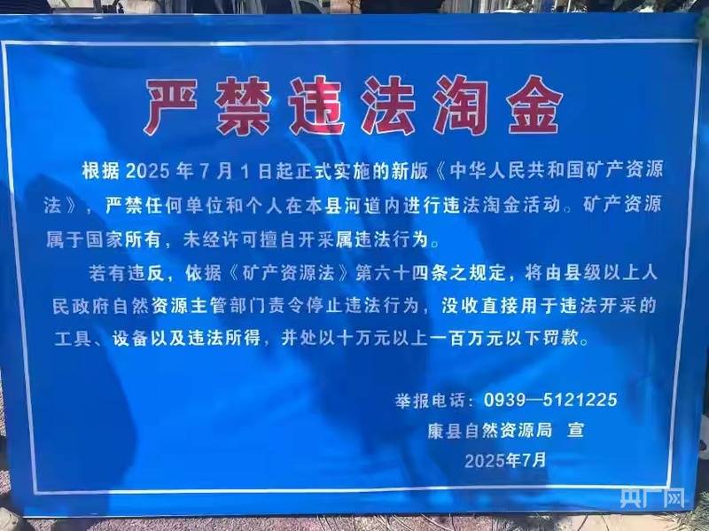 根据陈斐发布的图片显示,这张警示牌是康县自然资源局发布。今年6月9日,康县城关镇政府在微信公号发布的《守护河道安全——城关镇严厉打击河道非法采金行为》文章称,甘肃陇南康县城关镇执法队在日常巡查中发现,城关镇境内燕子河河道出现群众使用工具非法采金行为,这一行为不仅破坏了河道的生态环境,还对河道安全造成了潜在威胁。为了坚决遏制流窜非法采金行为,确保河道内水生态环境干净、整洁、安全,城关镇联合县自然资源局、县水务局迅速开展打击河道非法采金行动,初见成效。