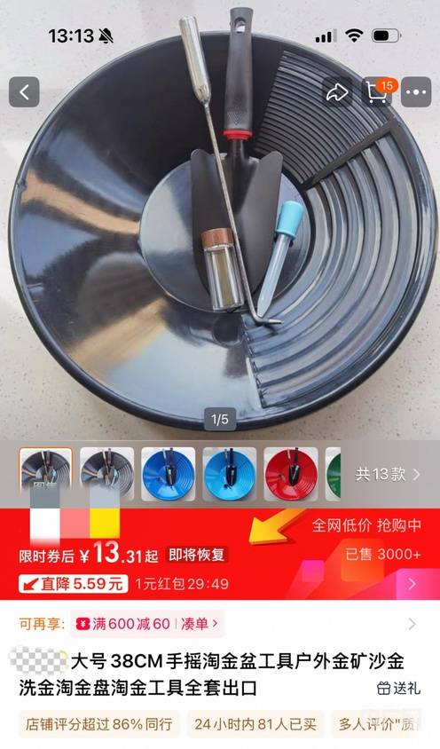 随着淘金热潮的兴起,也带动了相关淘金工具在网上热销。记者在各大电商平台搜索发现,多家售卖淘金工具的店铺销量可观,不少商铺已付款人数超万人。其中,一款手摇淘金盘售价不到14元,销量达3000件。“这段时间,金价持续上涨,购买淘金工具的客户明显多了起来,店里的淘金相关产品都卖得很火。”该商铺老板说。