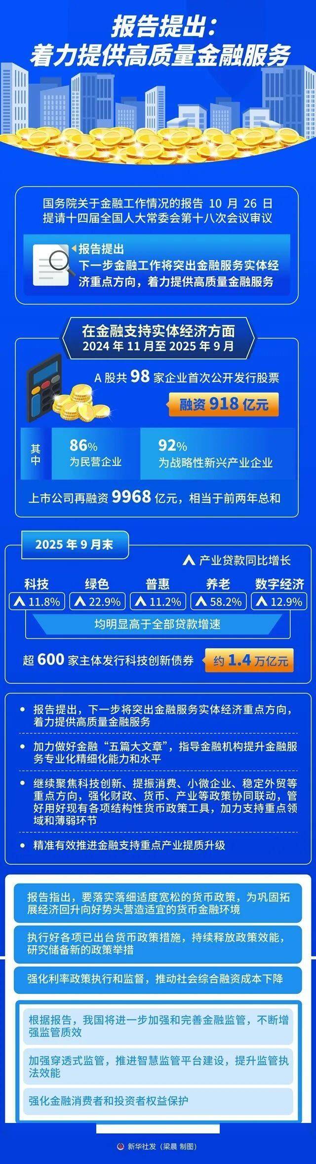 潘功胜介绍了金融支持实体经济情况。2024年11月至2025年9月,A股共98家企业首次公开发行股票,融资918亿元,其中86%为民营企业,92%为战略性新兴产业企业;上市公司再融资9968亿元,相当于前两年总和。2025年9月末,科技、绿色、普惠、养老、数字经济产业贷款同比分别增长11.8%、22.9%、11.2%、58.2%、12.9%,均明显高于全部贷款增速。超600家主体发行科技创新债券约1.4万亿元。