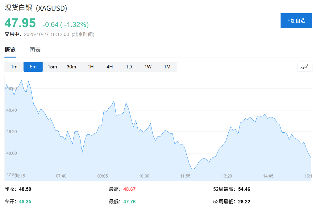 在市场情绪转变之际,白银价格正从高点回撤。周一,现货银价一度下跌1.7%。截至发稿,银价报每盎司47.95美元。此前的10月17日,银价曾触及每盎司54.4796美元的历史最高纪录。