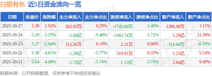 股票行情快报:白银有色(601212)10月27日主力资金净买入362.93万元