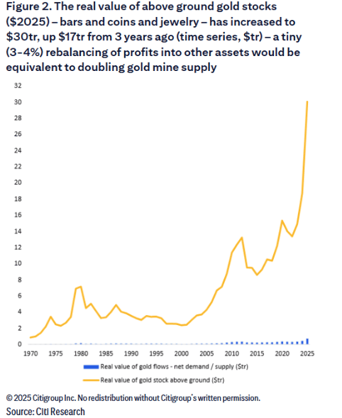 花旗警告称,只需要对这17万亿美元的利润进行小幅度的获利了结——例如仅2%的仓位调整(约等于3-4%的利润兑现),其释放的黄金供应量就相当于全球矿山年产量的两倍。