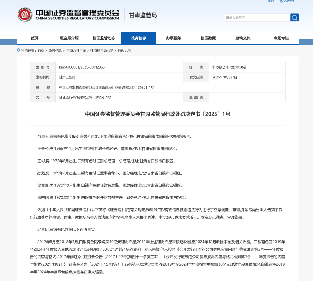 10月27日,中国证券监督管理委员会甘肃监管局发布行政处罚决定书〔2025〕1号。
