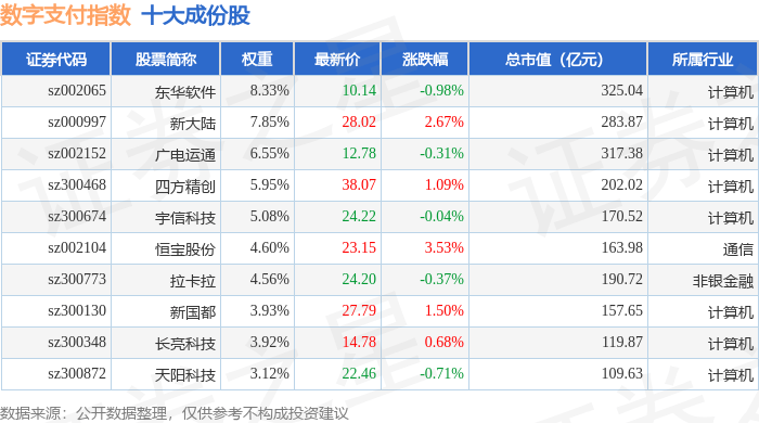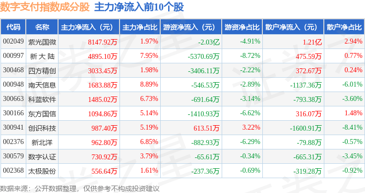 资金流向方面,数字支付(980113)指数成份股当日主力资金净流出合计11.04亿元,游资资金净流出合计415.79万元,散户资金净流入合计11.08亿元。成份股资金流向详情见下表: