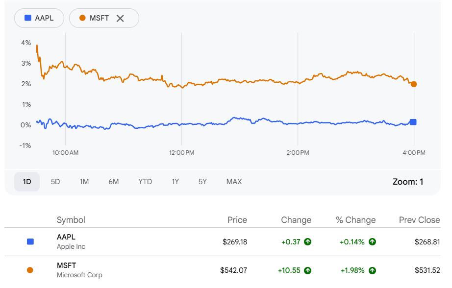 周二苹果股价微涨0.07%,公司市值曾在盘中突破4万亿美元。另一科技巨头微软的股价当日也上涨约2%,使其市值同样突破4万亿美元,并成功收于该关口之上。