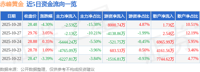 证券之星消息,截至2025年10月28日收盘,赤峰黄金(600988)报收于28.48元,下跌4.3%,换手率3.41%,成交量56.71万手,成交额16.43亿元。