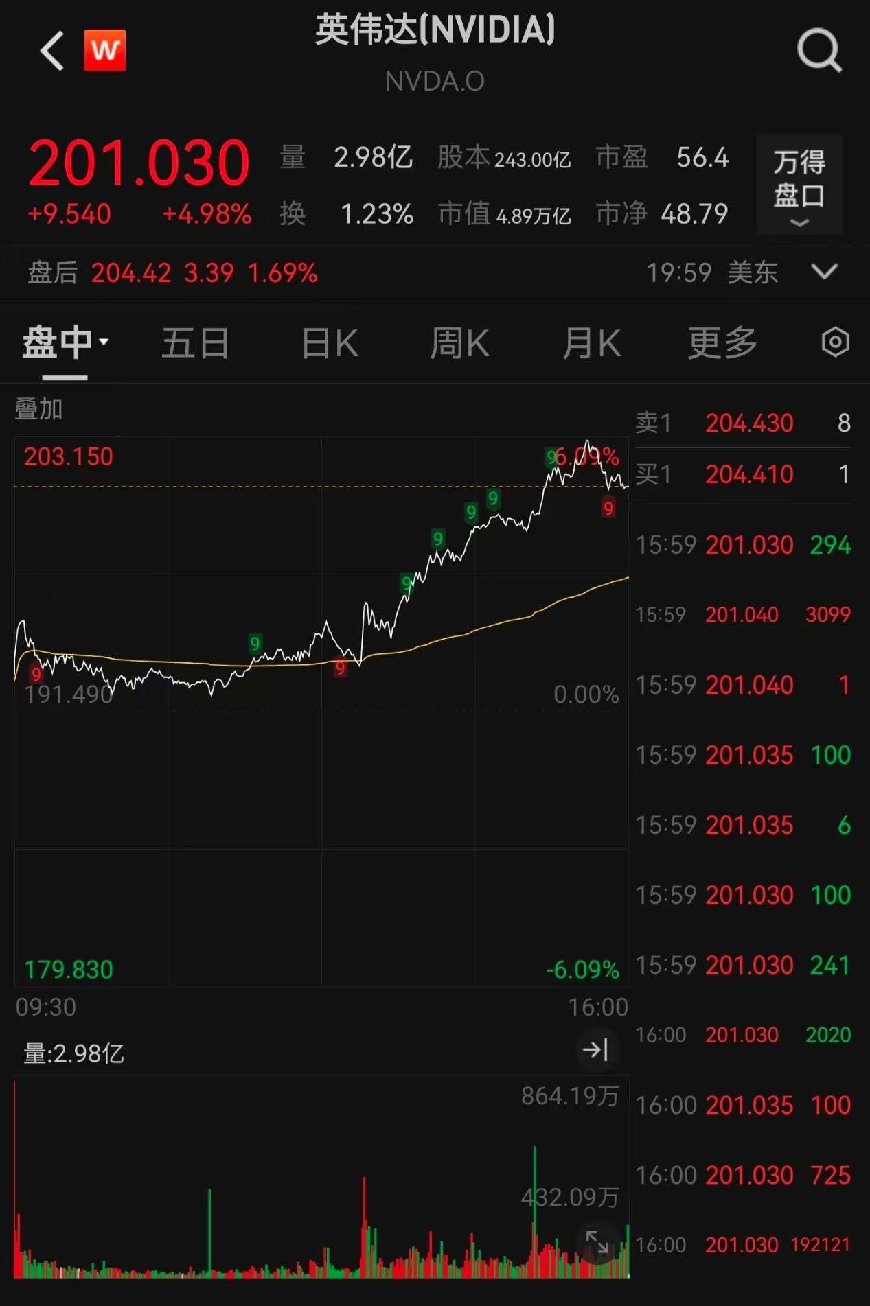 当地时间10月28日,英伟达股价涨幅达4.98%,报收201.03美元/股,市值达4.89万亿美元。