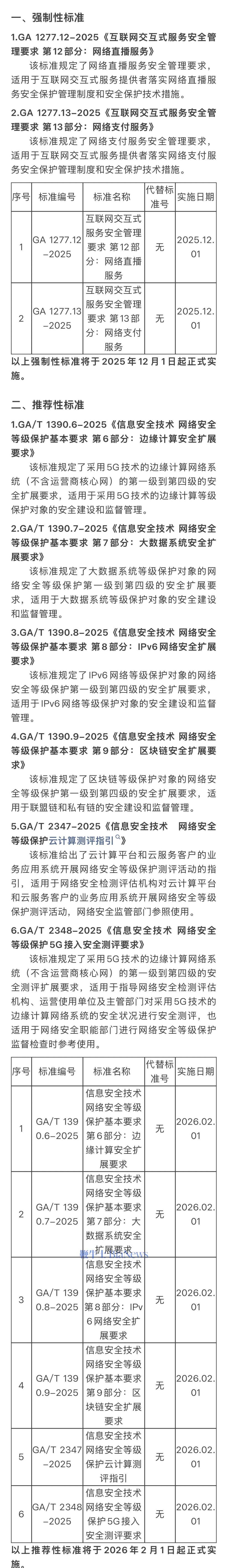 近日,公安部发布的2025年第1号《中华人民共和国公安部公共安全行业标准公告》,由公安部信息系统安全标准化技术委员会归口的8项公共安全行业标准正式发布。
