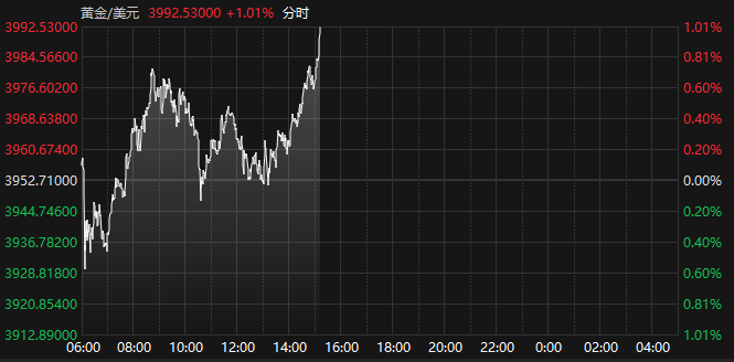 据Choice数据,10月29日,国际现货黄金午后震荡上行,截至15:12报3992.53美元/盎司,日内涨超1%,逼近4000美元/盎司关口。