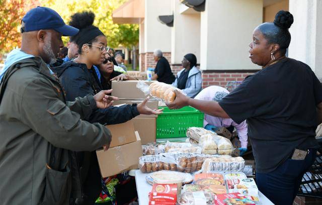 10月21日,在美国马里兰州海厄茨维尔市,联邦雇员领取免费食品。新华社发